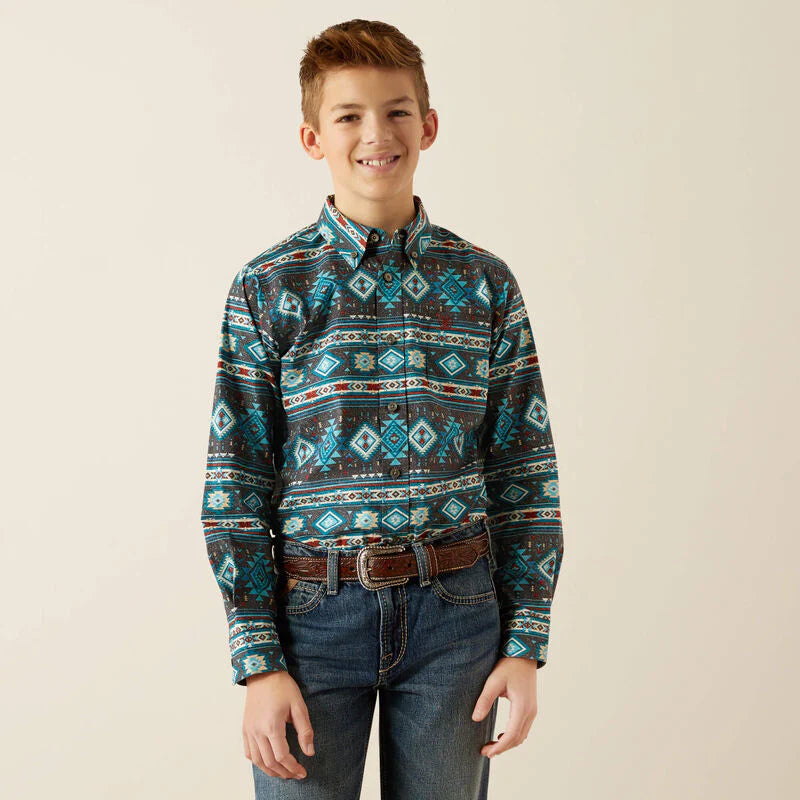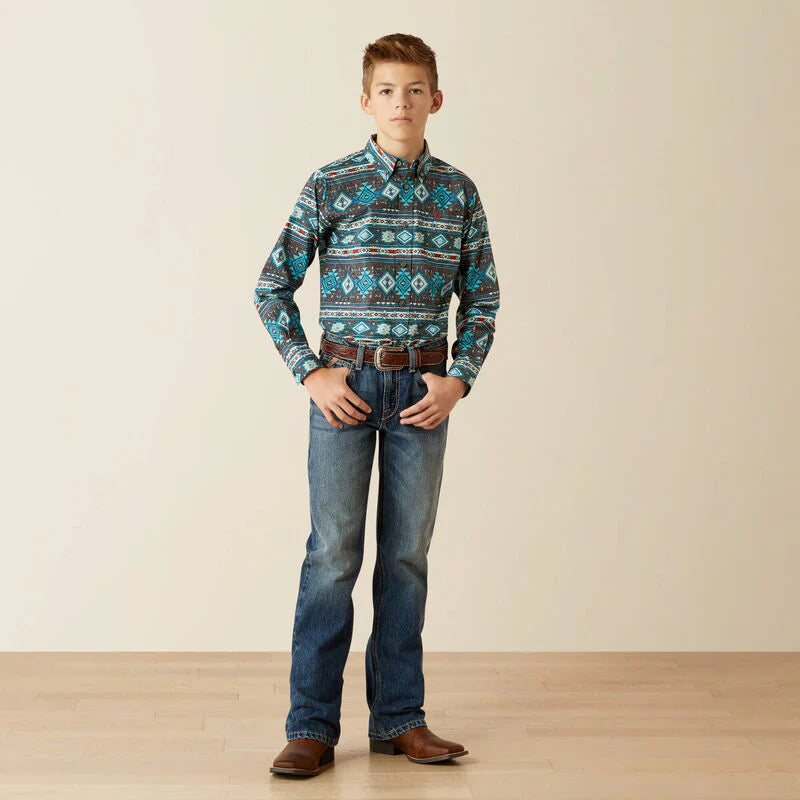 Boy's Ariat Prestcot Classic Fit Long Sleeve Shirt in Teal Multi CLOSEOUT