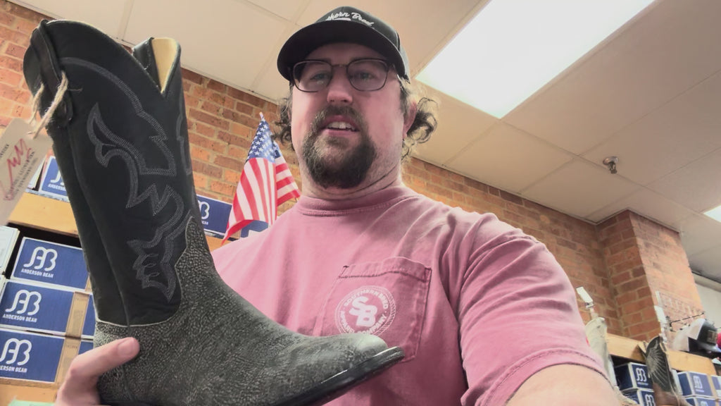 These Boots & More exclusive design boots are made of beautiful Grey Safari Cape Buffalo with 12 Inch Black Buffamonte tops with Safari Men's Anderson Bean grey Safari Cape Buffalo cowboy boots with a black 12 Inch shaft and a square toe. Buffalo overlay on the pull tabs. They feature a square toe, cushion insoles, and walking heel. They have a black hybrid leather/rubber outsole. These boots are hand made in Mercedes, Texas.