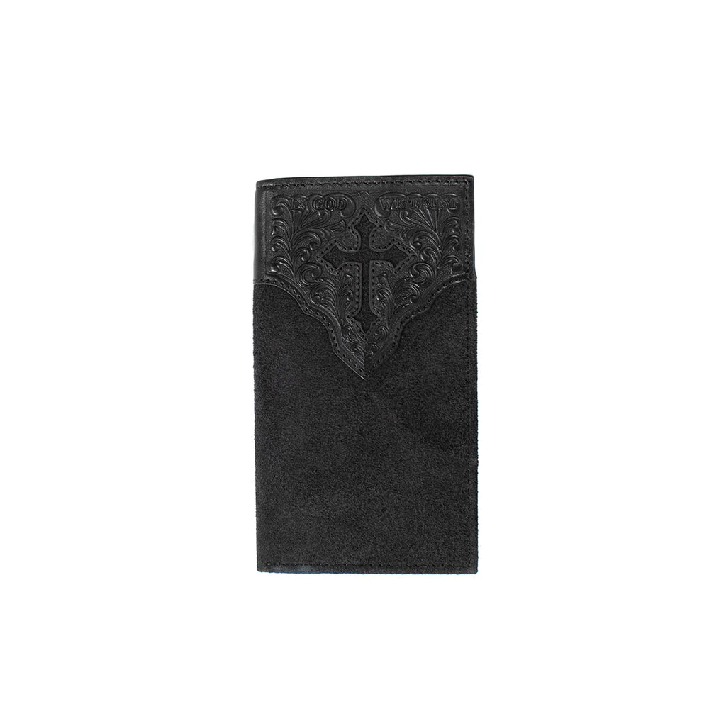 This Nocona rodeo wallet by M&F Western Products is genuine leather roughout and has a hand tooled floral tab with a filigree cross and In God We Trust across the top of the tab.