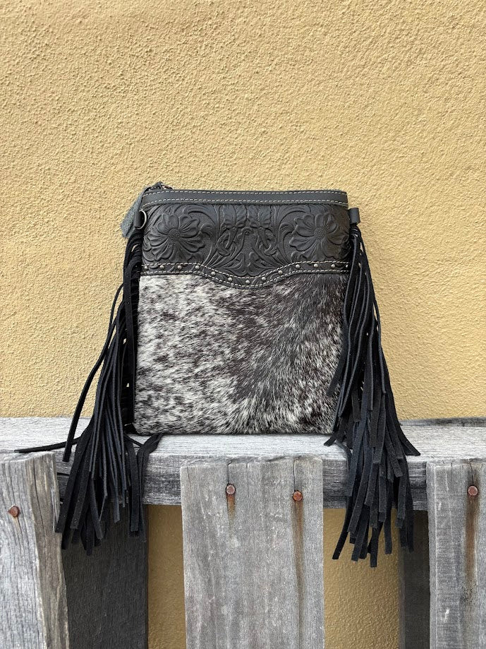 Top Notch Accessories Betty Cowhide and Black Leather Crossbody Fringe Purse