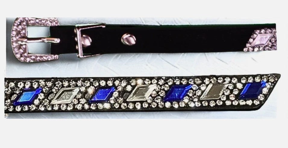 Black Leather Hat band with Blue/Clear Diamond Crystals