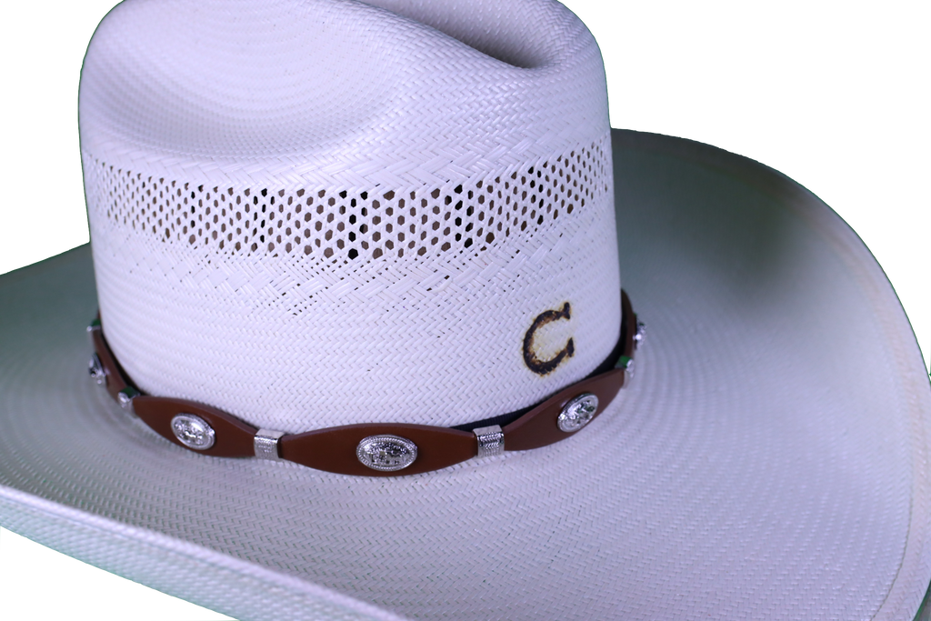 o. Crafted from rich leather and adorned with striking Silver Praying Cowboy Conchos, this band will accent any hat. This hatband uses a belt style adjustment so it will accommodate any size hat.