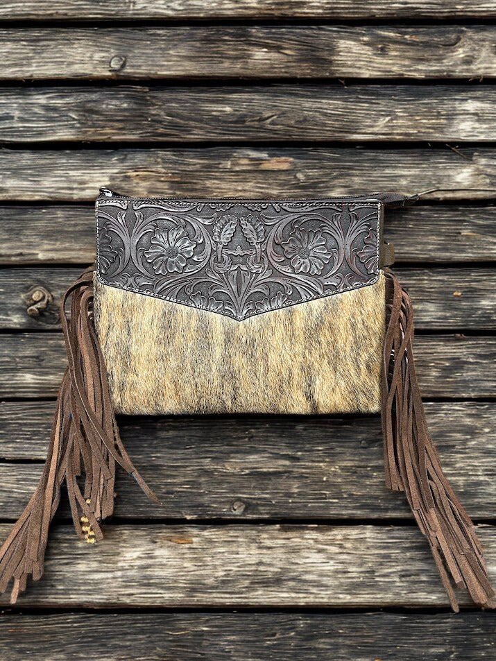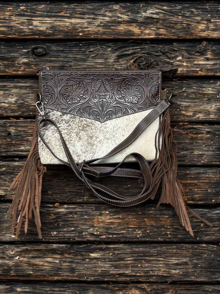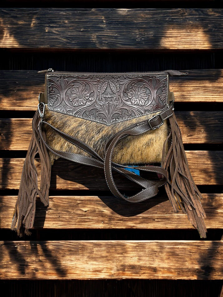 This crossbody purse features a solid leather back with a zippered concealed carry pocket. The front is cowhide and tooled leather with fringe sides. It has a zippered closure and the inside has a additional zippered pocket and six credit card slots. The strap is removable and adjustable. This bag is 11 1/2 inches long, 8 inches tall, and approximately 2 inches deep.