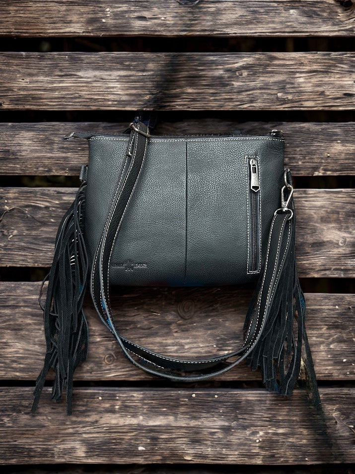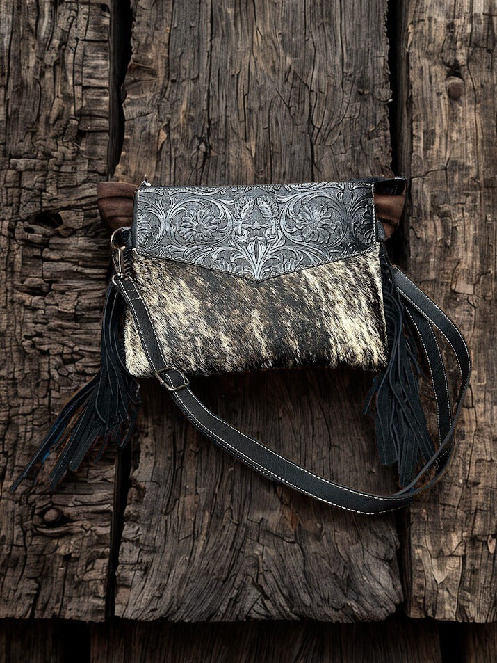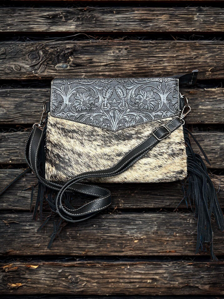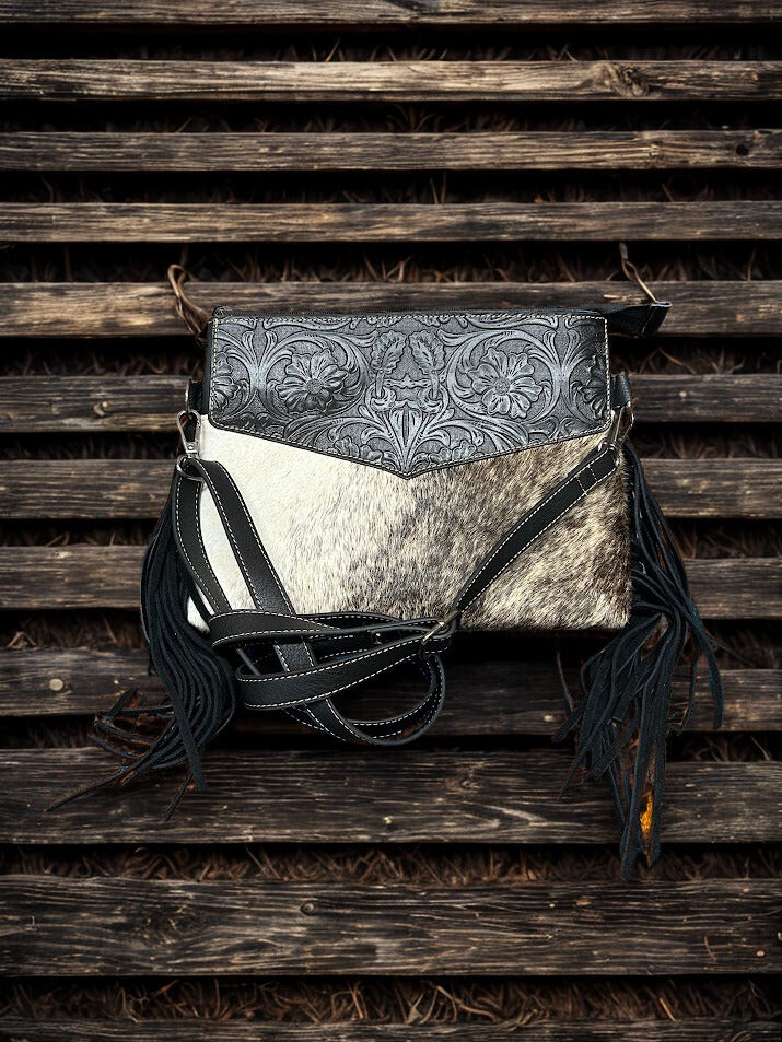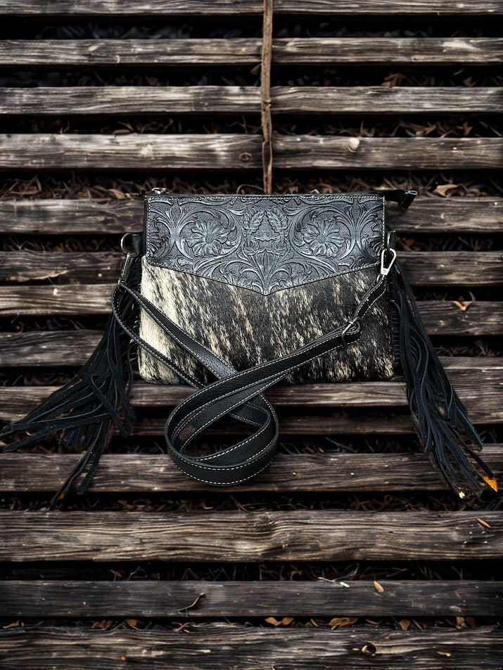 This crossbody purse features a solid leather back with a zippered concealed carry pocket. The front is cowhide and tooled leather with fringe sides. It has a zippered closure and the inside has a additional zippered pocket and six credit card slots. The strap is removable and adjustable. This bag is 11 1/2 inches long, 8 inches tall, and approximately 2 inches deep.